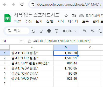 아래 예시를 따라 구글 시트의 각 셀에 환율을 입력해보세요.
