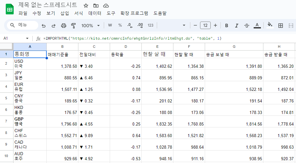 - 셀 A1: =IMPORTHTML("https://example.com/exchange-rates", "table", 1)