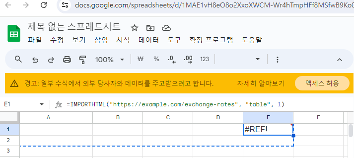 이 함수는 해당 URL에서 첫 번째 테이블을 가져와 구글 시트에 표시합니다.