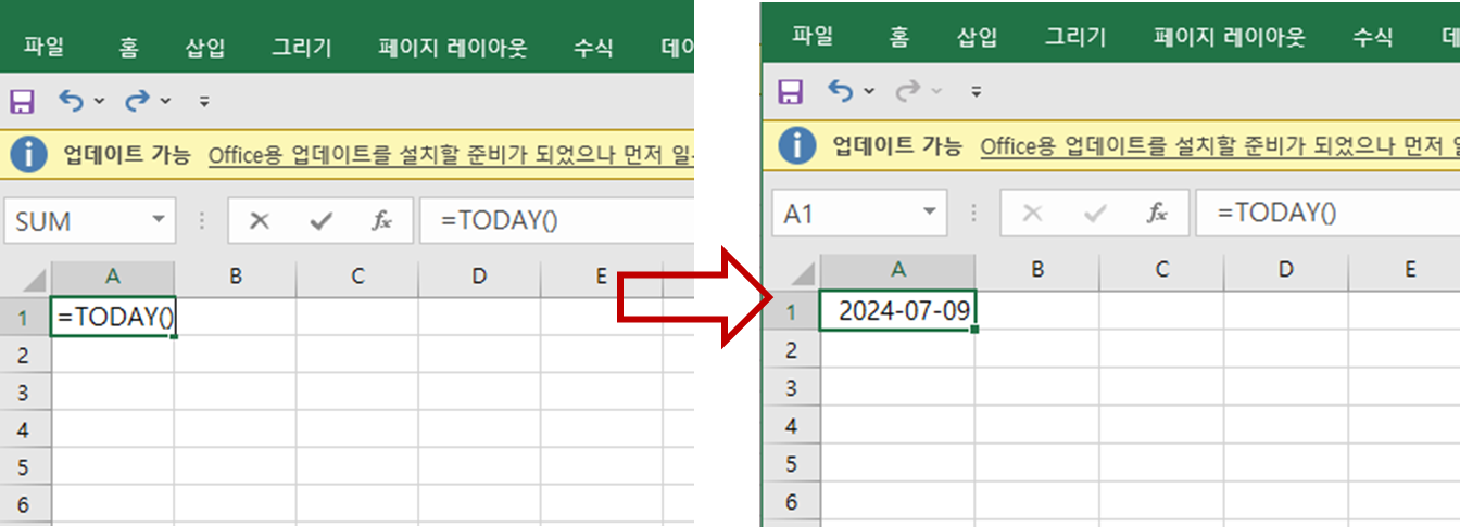 - 수식 입력줄에 =TODAY()를 입력하고 Enter 키를 누릅니다.
